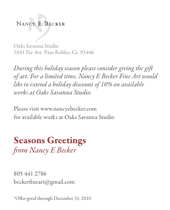 Nancy Becker is a landscape painter whose use of color, texture and light captures the tranquility and mysteriousness of California’s sacred spaces of nature and the animals that inhabit them. Her tonal paintings of the Central Coast’s ranches, vineyards, and rolling hills create a mood that is mystifying and compelling, and dreamlike in its softness. These rural landscapes are subtle yet powerful, evoking strong emotions in those who experience their silent wonder. It is the expression of her own emotion through her art that lends her work the ability to take its viewers into the very midst of nature’s intimate venues. To view Nancy Becker’s paintings is to spend a quiet moment in a serene locale, where life’s rough edges are somehow absorbed.